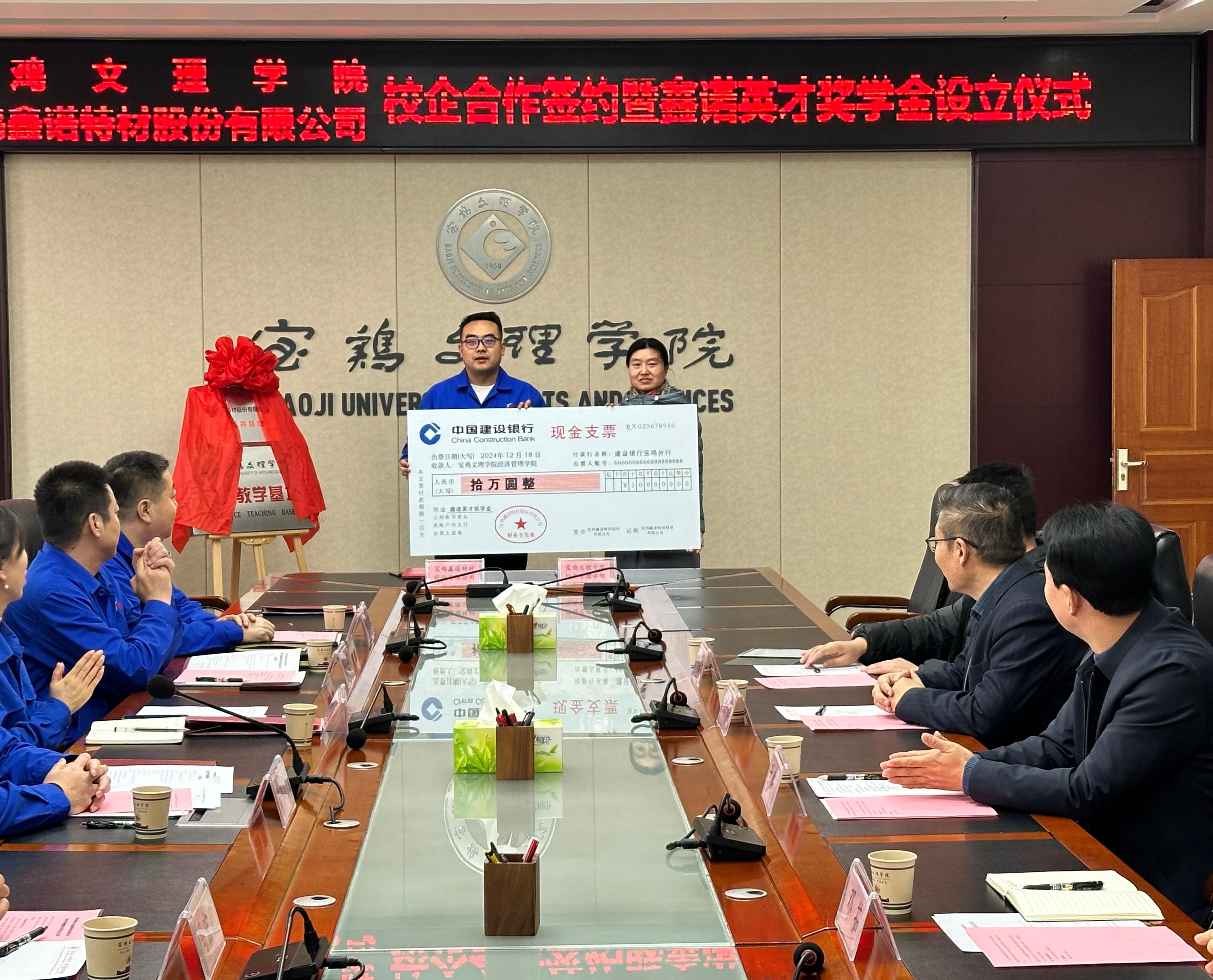 12月18日,寶雞鑫諾特材股份有限公司與寶雞文理學(xué)院校企合作簽約儀式暨鑫諾英才獎(jiǎng)學(xué)金設(shè)立儀式在寶雞文理學(xué)院圖書(shū)館舉行。寶雞文理學(xué)院副校長(zhǎng)于建偉、經(jīng)濟(jì)管理學(xué)院領(lǐng)導(dǎo)及學(xué)生代表,鑫諾特材黨支部書(shū)記、董事長(zhǎng)鄭永利及高層管理人員出席了此次儀式。