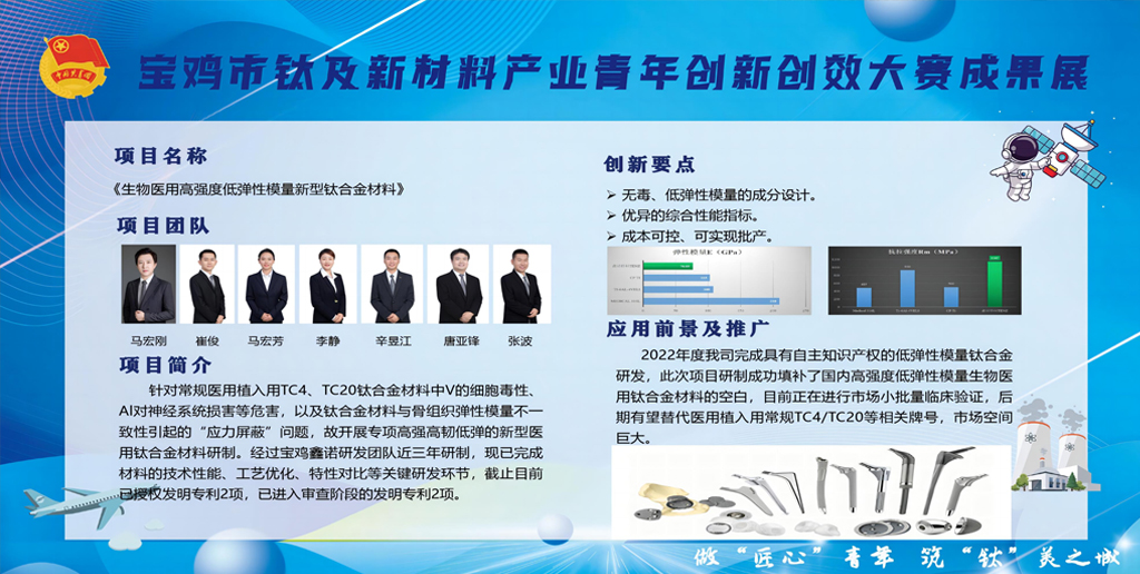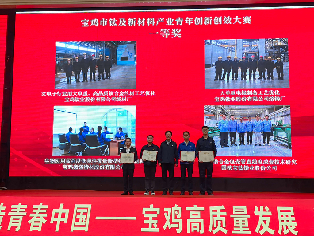 4月29日,寶雞市紀念五四運動105周年暨青春助力“三個年”活動在寶雞萬福酒店舉行。會上,寶雞鑫諾特材股份有限公司《生物醫(yī)用高強度低彈性模量新型鈦合金材料》項目榮獲“寶雞市鈦及新材料產業(yè)青年創(chuàng)新創(chuàng)效大賽”一等獎。